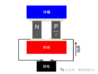 Principiul răcirii semiconductoarelor (efectul Peltier) : atunci când curentul trece prin suprafața de contact dintre materialele semiconductoare de tip p și de tip n, purtătorii migrează și absorb căldură pentru a obține răcirea (capătul rece), în timp ce căldura este eliberată pe cealaltă parte (capătul fierbinte)